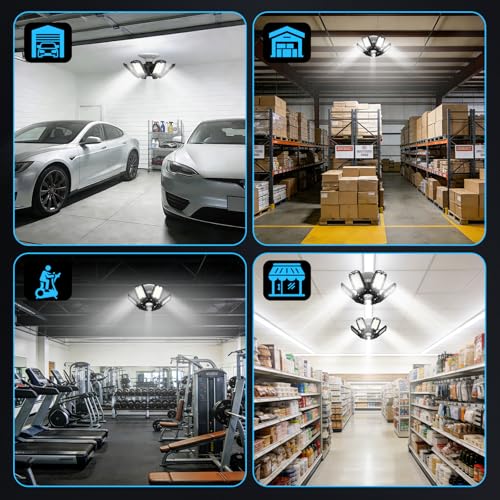 - 【6+1 Newest Garage Lights】With 6+1 deformable panels, the best led garage ceiling lights can be adjustable from 0 to 90 degree, which illuminate each corner of your garage in 360 full coverage without visual blind spots and dizziness. The workshop lights will provide better light than 3, 4 and 5 panel garage lights ceiling led on the market.