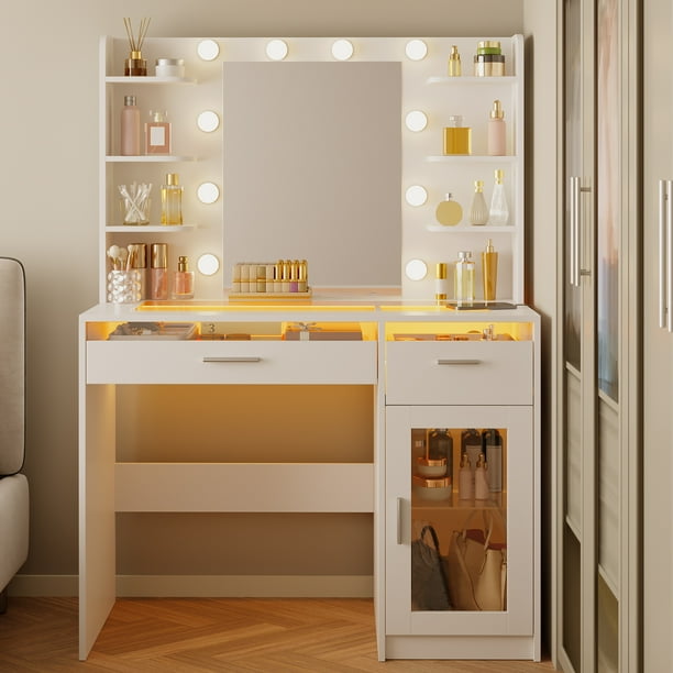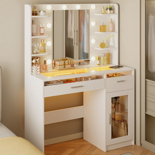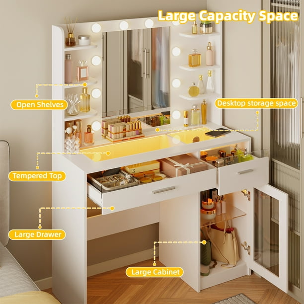 Specification: Tomnk woo White Vanity Desk with Mirror & Lights, Power Outlet, 3 Colors, 2 RGB Drawers, 6 Shelves