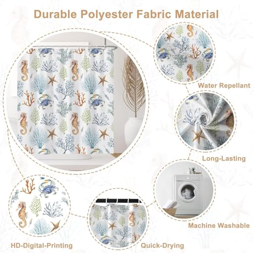 Specification: Ttincceer Nautical Coastal Shower Curtain, Sea Horse Coral Crab Starfish Seashell Conch Bathroom Curtain, Ocean Theme Underwater Marine Shower Curtain Set with 12 Hooks for Bathroom, 72″ Wx72 L
