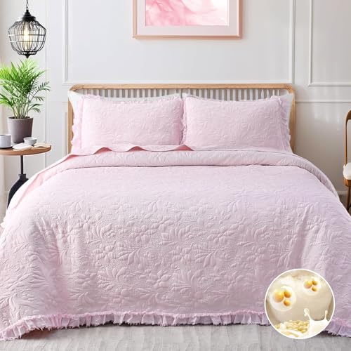 Specification: Uspring Pink Ruffled Floral Quilts Queen Size Soybean Fiber Filling Bedding Set 3 Piece, Stone-Washed Microfiber Farmhouse Shabby Chic Lightweight Soft Bedspread Coverlet for All Season, 90” x 90”