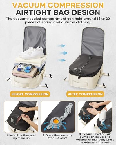 Vacuum Travel Backpack for Women, Personal Item Carry on Vacpack Backpacks Airplane Essentials Approved 18x14x8 inches for Men,Laptop Waterproof Work Compression bags Casual Daypack,Beige