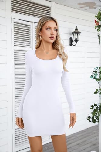 VICHYIE Women Dress Square Neck Bodycon Ribbed Long Sleeve Tight Fall Mid Thigh Pencil Above Knee Mini Dresses White M