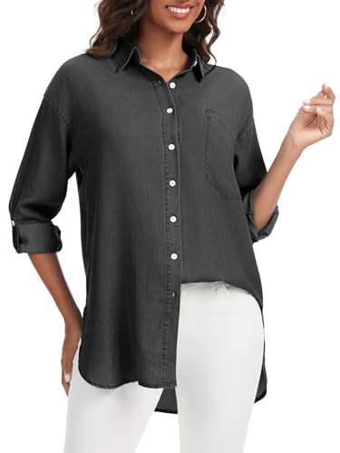 Women’s Denim Button Down Shirt Long Sleeve Relaxed Fit Chambray Top Lightweight Lyocell Blouse (Black,XL)