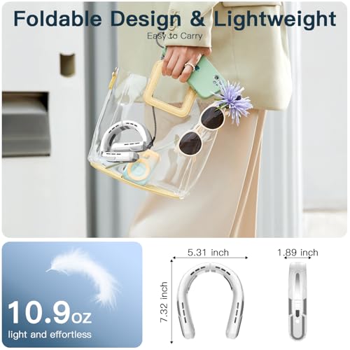 - 【Portable & Lightweight】Our wearable neck fan features lightweight and foldable design, 7.3*5.3*1.8 inch, only 10 ounces weight, the small size design is convenient for you to carry while traveling. skin-friendly ABS material, putting less strain on the neck. The 80°~150° adjustable angle design fits different neck sizes. you can wear it for a long time comfortably to keeping you cool.