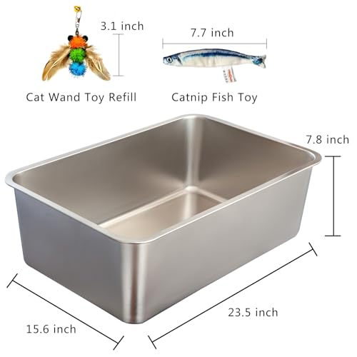 Specification: XXL Stainless Steel Cat Litter Box, Includes Catnip Fish Toy & Wand Feather Toy Refill, Extra-Large Metal Litter Pan for Big Cats & Multi-Cat Homes, Pet Toilet Supplies for Kitten