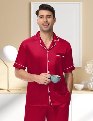 Specification: YOPUGEE Men Satin Silk Pajamas Set 2 Piece Button Down Sleepwear Set Long Pants Loungewear with Pockets Red M