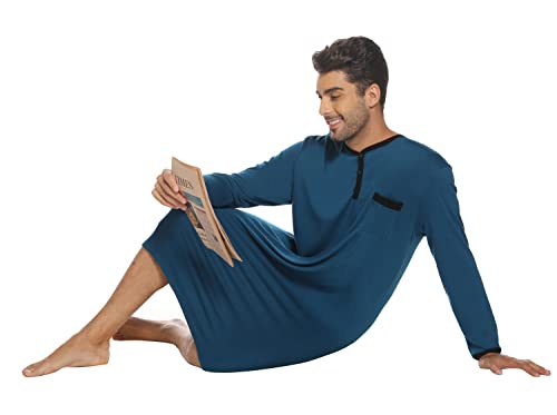 Yukiuiny Men’s Sleepwear Henry Collar Long Sleeve Nightshirt, Knee-Length Breathable Nightgown, Comfortable and Loose Lounge Wear with Chest Pocket, Blue XXL