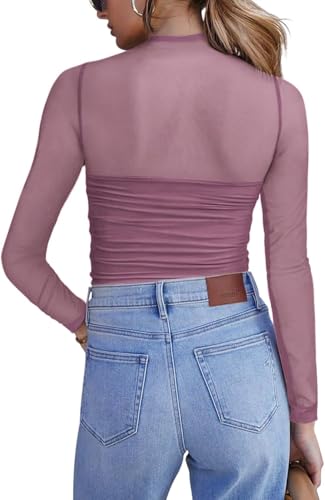 Specification: Zeagoo Women’s Sexy Mock Turtle Neck Long Sleeve Tops Sheer Mesh Ruched Trendy Going Out Shirts Blouse Fuchsia