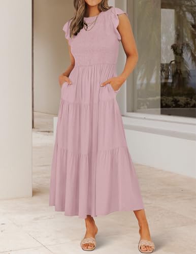 Specification: ZESICA Women’s 2025 Summer Casual Flutter Short Sleeve Crew Neck Smocked Elastic Waist Tiered Midi Dress,Dark Pink,Small